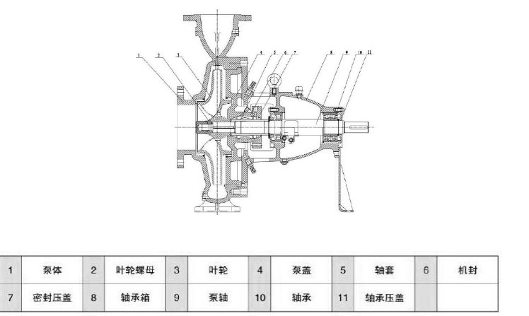 1、臥式后開門結構,泵頭與電機采用聯(lián)軸器連接,安裝在底板上,葉輪為后開式,三只軸承,軸封采用外裝式機械密封,設有冷卻裝置,軸承體的油位用油鏡觀察;結構緊湊合理。