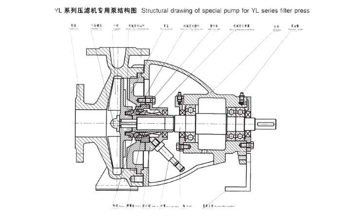 YL型壓濾機泵是在同類進口設備的基礎上,結合國內壓濾機的使用特點和要求,通過有關科研部門和專家研制改進而成的臥式、單級、單吸離心泵、是與壓濾機配套的一種理想的泵設備,很好的解決了一般離心泵和容積泵配用在壓濾機壓力不足、密封易損、零部件壽命短等弊病,其尺寸和性能符合ISO2858標準。